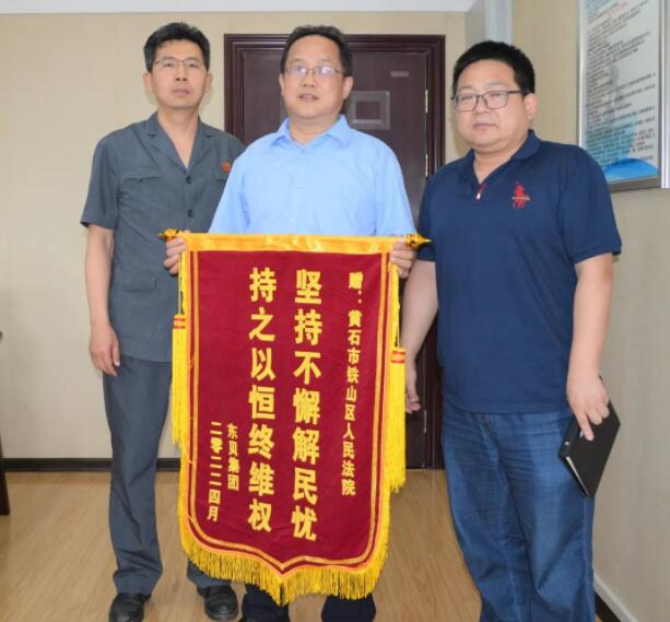?。ㄍㄓ崋T 魏耀)正值端午臨近之際 ,東貝集團黨委副書記、紀委書記、副總裁廖漢鋼,法務部長桂州等人帶著“堅持不懈解民憂、持之以恒終維權”的錦旗來到黃石市鐵山區人民法院表示深切謝意。鐵山法院院長、黨組書記習少婷,執行局長熊曙光,執行團隊負責人李瑾璆熱情接待,并進行友好交流。